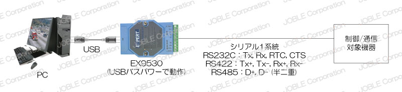 EX9530/9531は、PCにUSB接続することでシリアル通信による入出力を行う変換モジュールです。